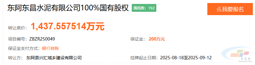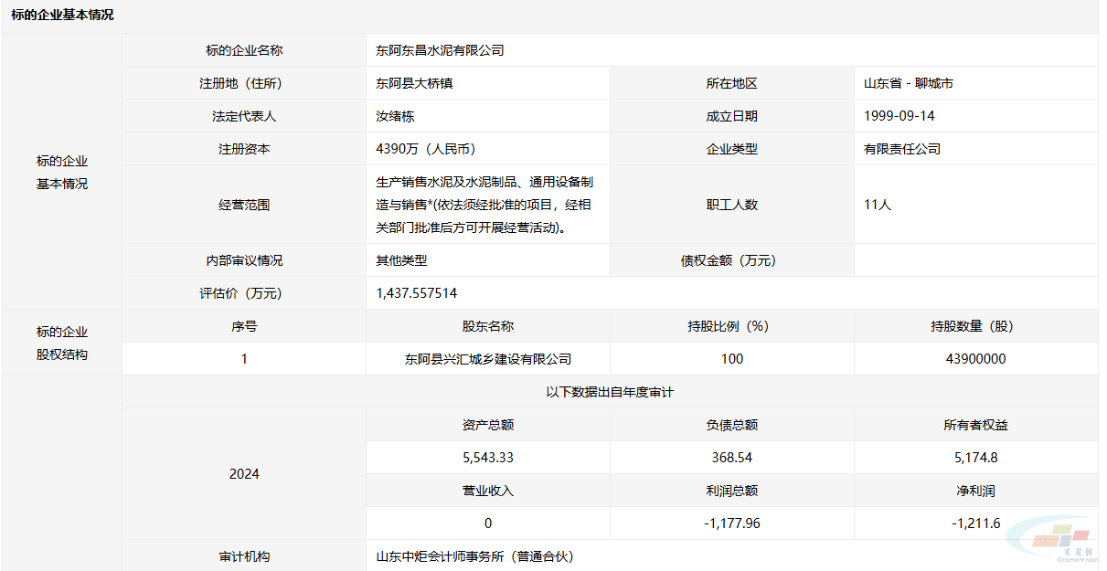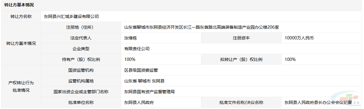近日,东阿东昌水泥有限公司100%国有股权挂牌转让,转让底价为1437.557514万元。