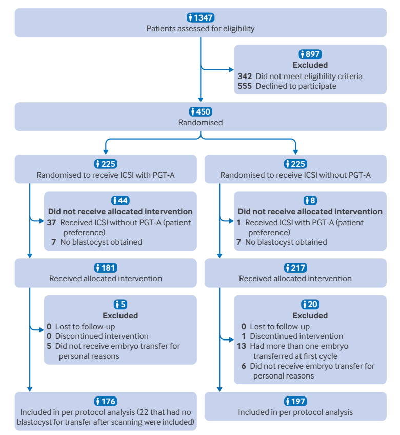 为了回答这一关键问题,黄荷凤院士团队自2018年起,联合浙江大学、复旦大学、上海交通大学等高校的四家生殖医学中心,开展了一项多中心、开放、随机对照试验,系统比较“ICSI+PGT-A”与常规ICSI在严重男性不育患者中的治疗效果。研究严格筛选了1347对不孕夫妇,最终纳入450对完成试验。
