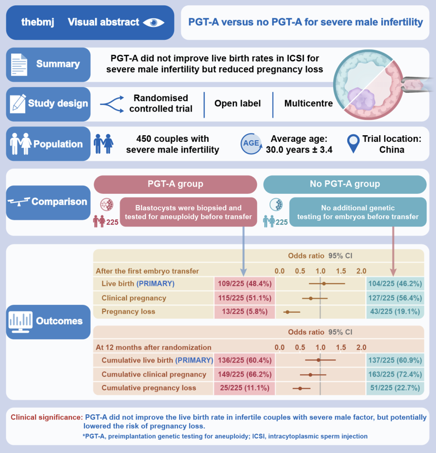 当前,卵胞浆内单精子注射(ICSI)技术,即俗称的“第二代试管婴儿”技术,是严重男性不育患者的主要助孕手段。而胚胎植入前遗传学检测(PGT-A)技术,作为“第三代试管婴儿”技术,因能提升胚胎筛选的准确性,受到越来越多医生与不孕患者的青睐。那么,严重男性不育患者究竟应选择ICSI,还是在其基础上叠加PGT-A以“双重保险”?这一问题长期悬而未决,国际医学界亦缺乏共识。