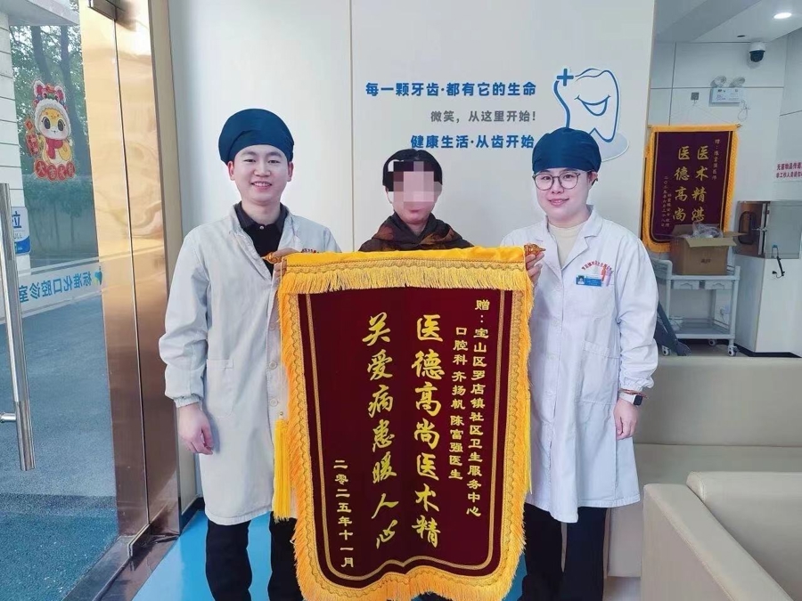 阳光明媚的冬日清晨,宝山区罗店镇社区卫生服务中心的诊室里来了一位熟悉的面孔——完成了根管治疗和种植牙修复的顾女士。她手里拿着一面鲜红的锦旗,“医德高尚技术精,关爱病患暖人心”几个金色大字格外醒目。