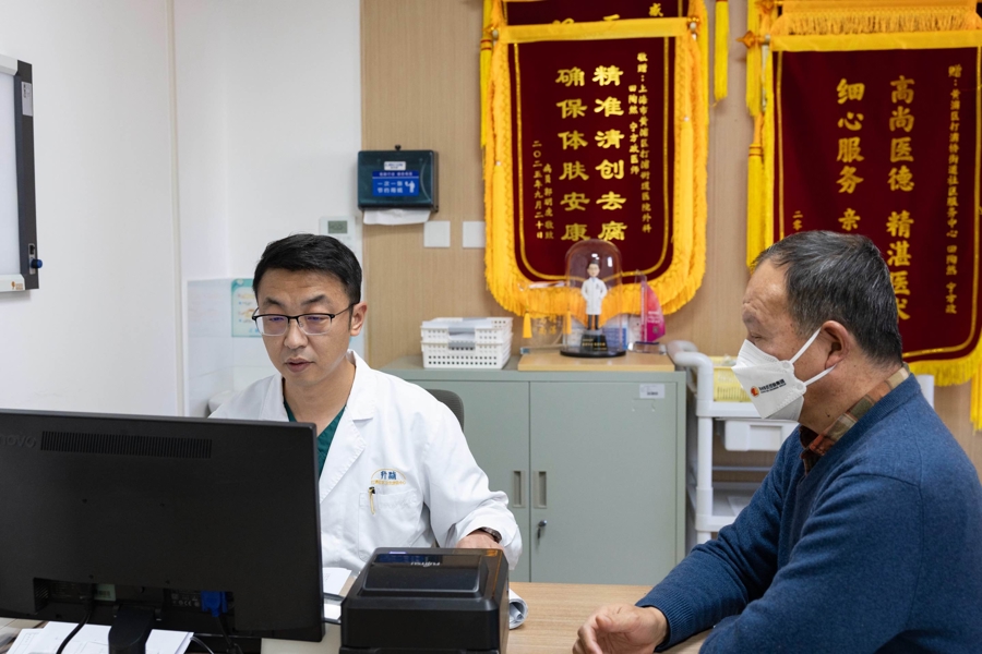 打浦桥社区卫生服务中心内,外科医生田陶然为居民诊治。